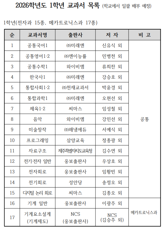 [2026학년도 입학전형] 예비고 1학년 교과서 목록